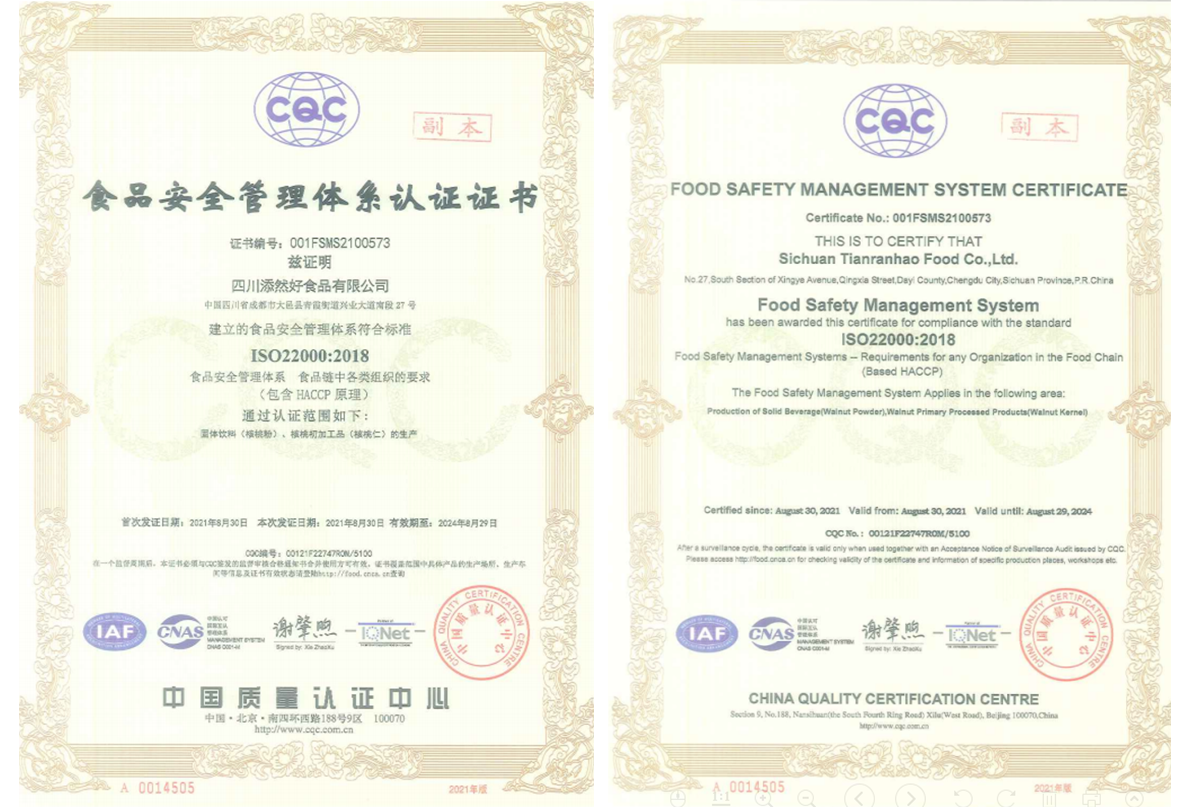2021年8月30日,我们获得了ISO9001和ISO22000双体系认证证书,此次认证的顺利通过,充分展示了公司全体员工的团结一致,为共同目标不断努力,勇往直前的精神面貌。在今后的工作中,我们也会一如既往地严格执行管理体系要求,持续改进!更优质的为客户服务!